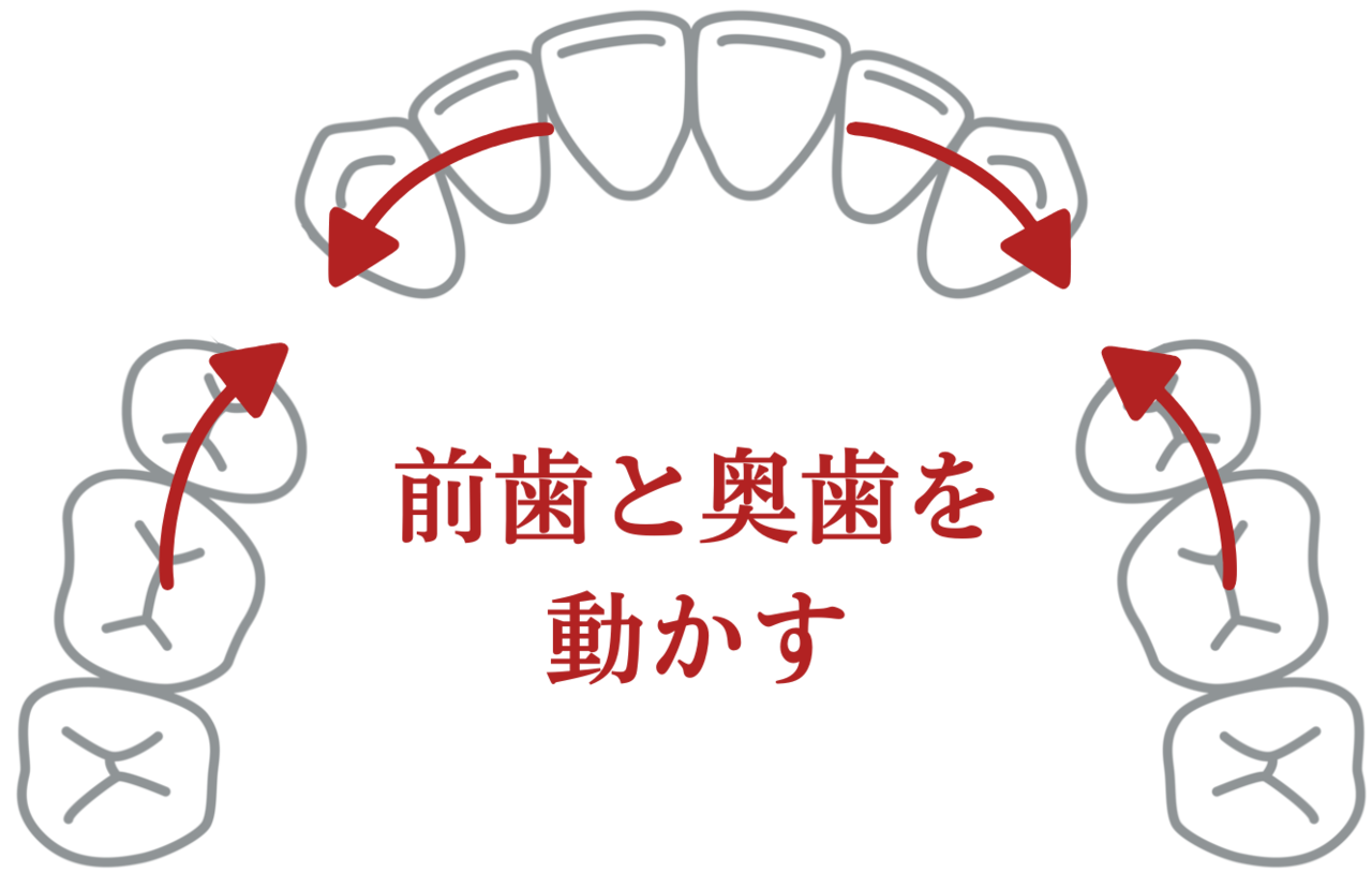こうして順繰りに奥へと歯を移動させることで、前歯をきれいに並べるスペースを確保できるというのが優れたポイント。