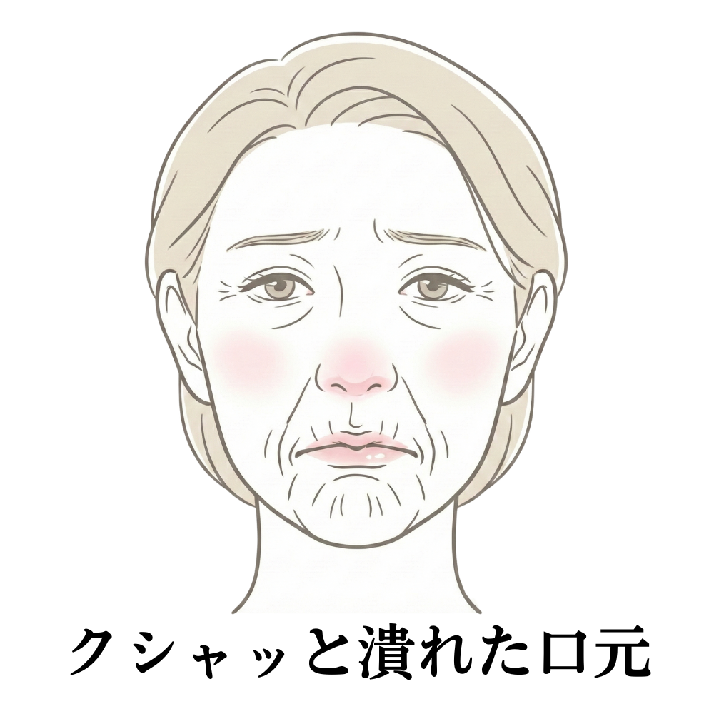 歯の高さが減ると、鼻から下がクシャッと潰れたようになり、一気に「お年寄りのような口元(老人様顔貌)」に。