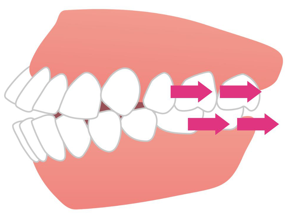奥歯が斜めに傾いて前歯を押し出していると、前歯を引っ込めるスペースがありません。