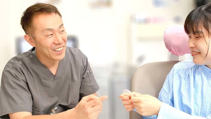 矯正用のマウスピースは滑らかな作りになっていますが、患者さまによっては違和感が大きいことがあります。そうした場合、装着時のちょっとしたコツをお教えし、少しでも快適に治療期間を過ごしていただけるよう努めています。